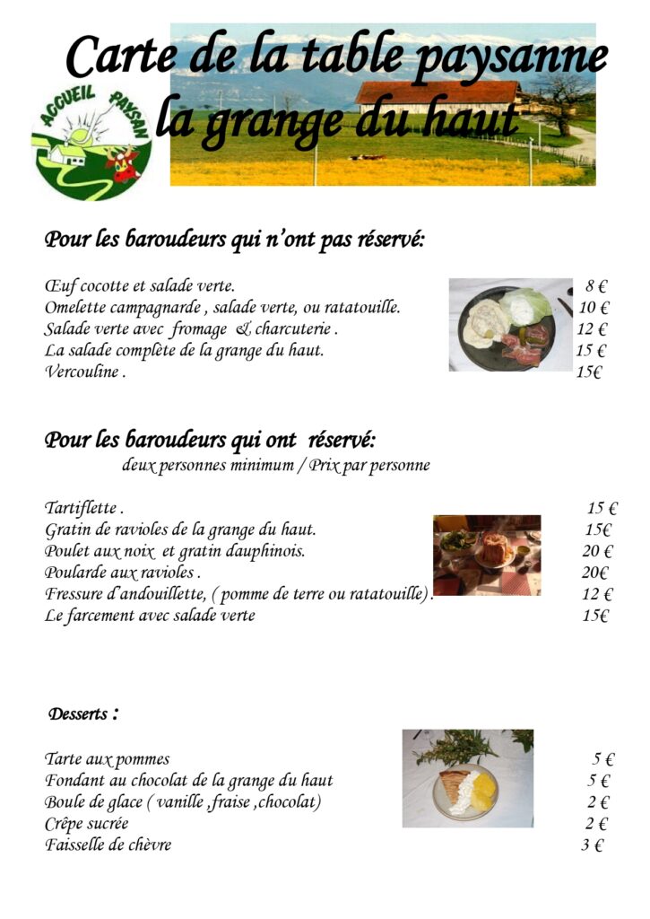 - Goûter : 4 € Casse croûte de pays, sucré, salé, élaborés essentiellement à partir des produits de saison de la ferme, du jardin, des cueillettes de plantes et fruits sauvages. Tisanes maison et sirops.